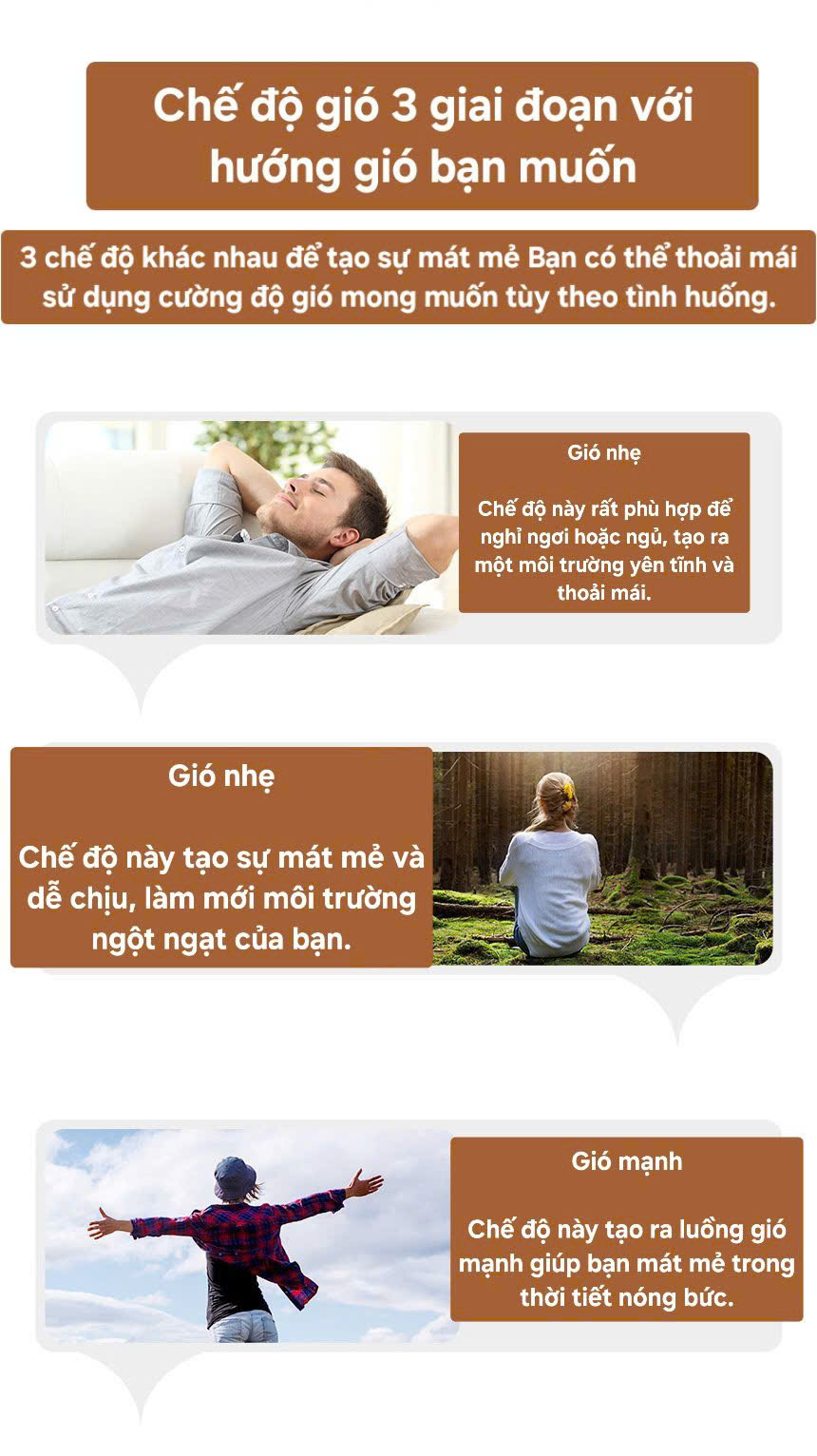 - 3 cấp độ gió: Gió nhẹ, gió mạnh, gió tự nhiên.