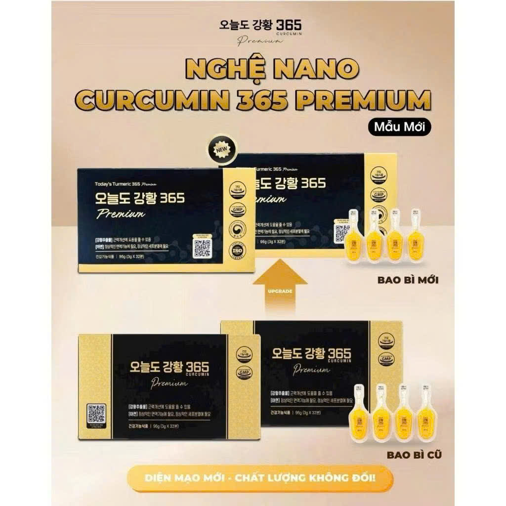 Tinh chất nghệ Nano Curcumin 365 Premium Hàn Quốc là phiên bản nâng cấp so với bản Nano Curcumin 365 được tinh chế từ nghệ tươi tự nhiên. 1 Hộp nghệ 365 Nano Curcumin Premium bao gồm 32 tép mỗi tép 3gram.
